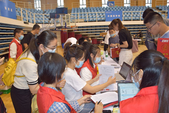 因为疫情原因,家长无法进入校园,学院特意组织志愿者,帮忙搬运行李。报到当天,阴雨绵绵,为了能让新生尽快入住宿舍,志愿者们冒着风雨,一趟又一趟地穿越校园,帮新生同学将行李搬到宿舍。注册报到现场,志愿者们耐心地为新生讲解报到流程、做好信息录入和资料物品的发放,一切井然有序。